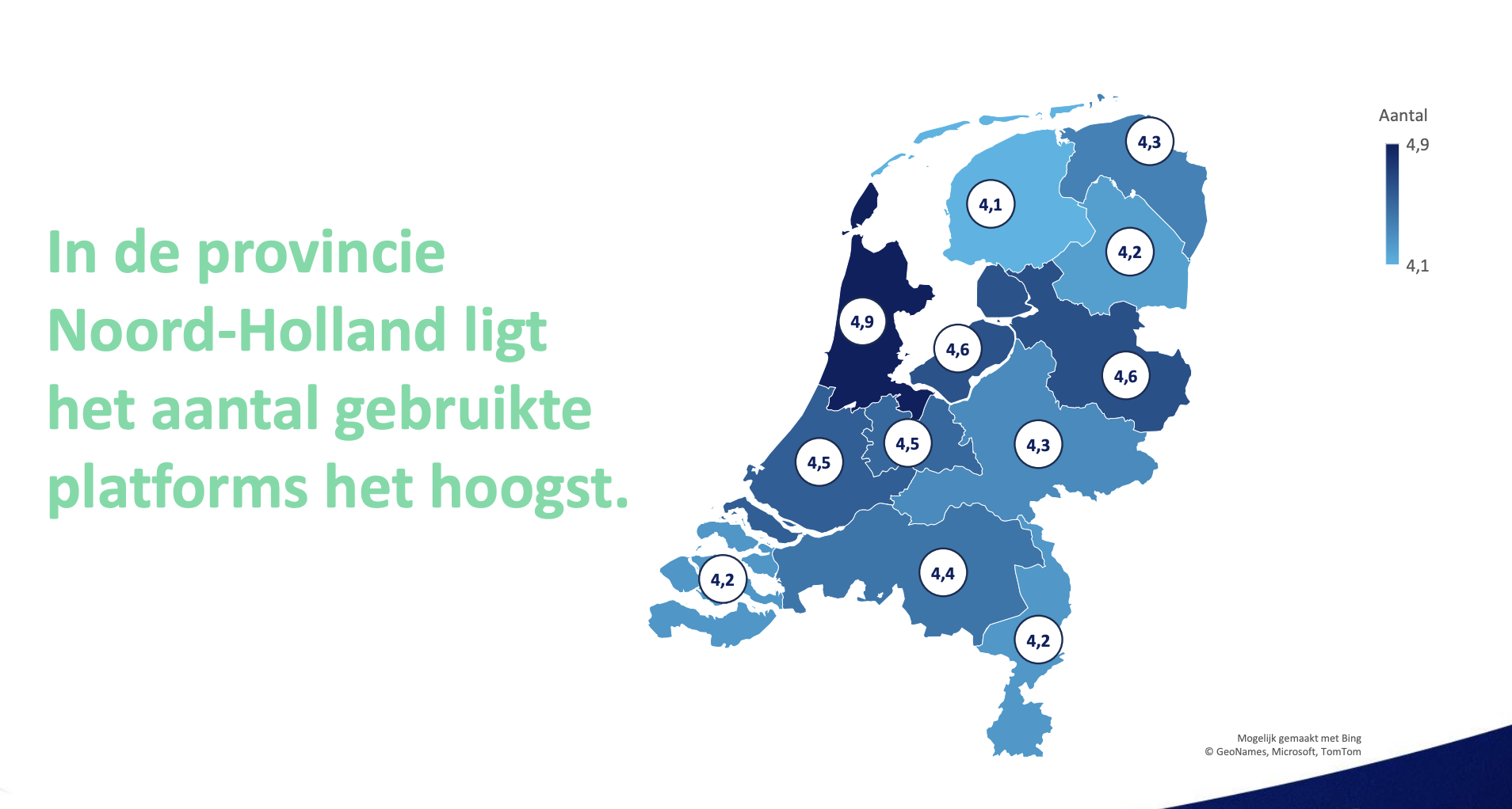 Wanneer we kijken naar de verschillen tussen de provincies van Nederland valt op dat Noord-Holland de “koploper” is in het aantal gebruikte social media platforms per persoon. In Friesland blijkt men minder aanwezig op de verschillende platforms.