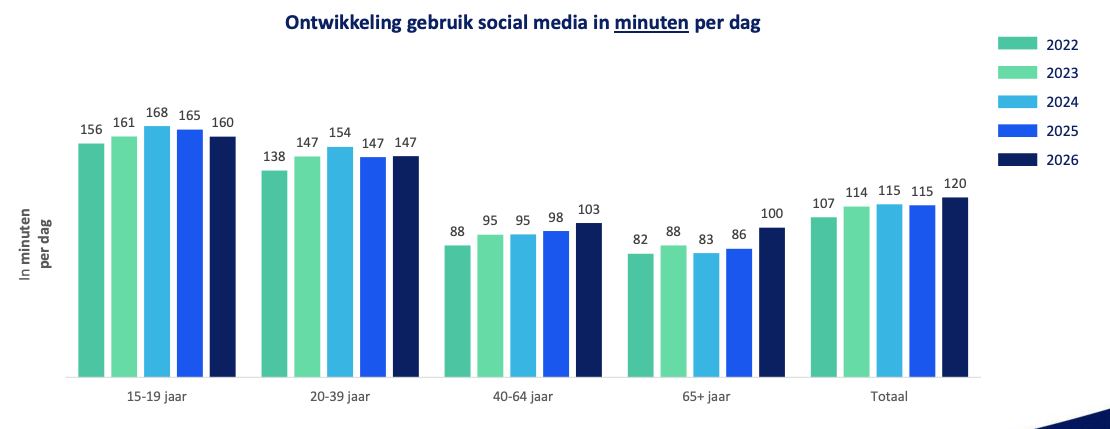 Gemiddeld besteden we zo’n 2 uur per dag aan social media. Bij jongeren daalt dat aantal minuten licht, terwijl het bij oudere doelgroepen juist iets toeneemt. Social media wordt dus steeds breder gedragen over alle leeftijden.