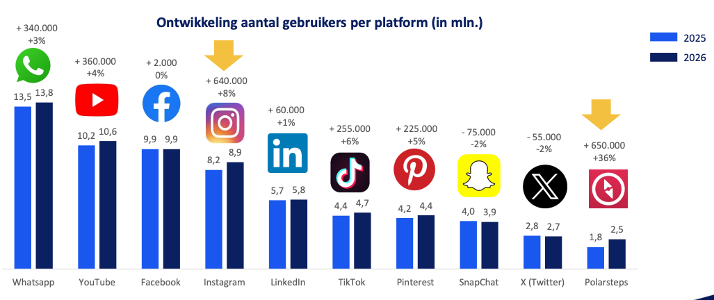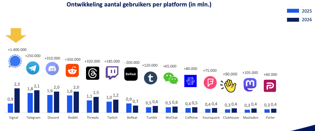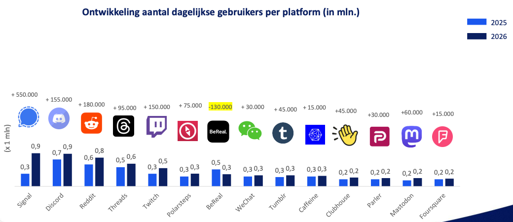 Bij de kleinere platformen gebeurt misschien nog wel meer. Signal groeit explosief naar 2,3 miljoen gebruikers en Polarsteps laat een opvallende groei van +36% zien.