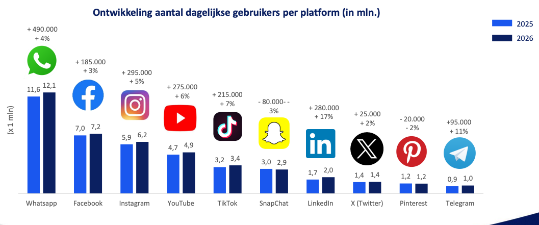 Als we kijken naar de grote platformen, dan zien we duidelijke winnaars in het Nationale Social Media Onderzoek 2026: