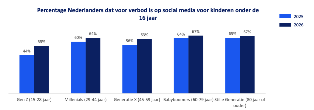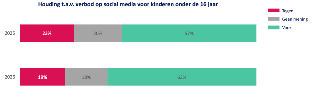 Een opvallend maatschappelijk signaal uit het onderzoek: 63% van de Nederlanders is voor een verbod op social media voor kinderen onder de 16 jaar. En die steun groeit juist onder jongere generaties.